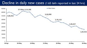 India’s Daily New Cases further decline to 1.65 Lakh Cases, Daily New Cases lowest in last 46 days