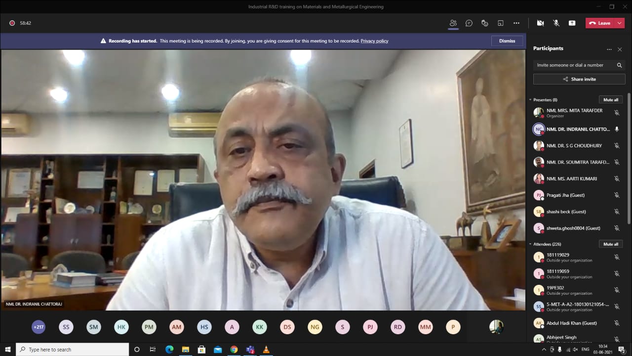 The inaugural program was held on the first day on June 03, 2021 which started at 10.30 am with the welcome address by Dr. Indranil Chattoraj, Director, CSIR-NML. Dr. Chattoraj gave a brief idea about the world class research facilities available at CSIR-NML and invited the participants to visit the laboratory when the situation improves and the country overcomes the Covid 19 pandemic.