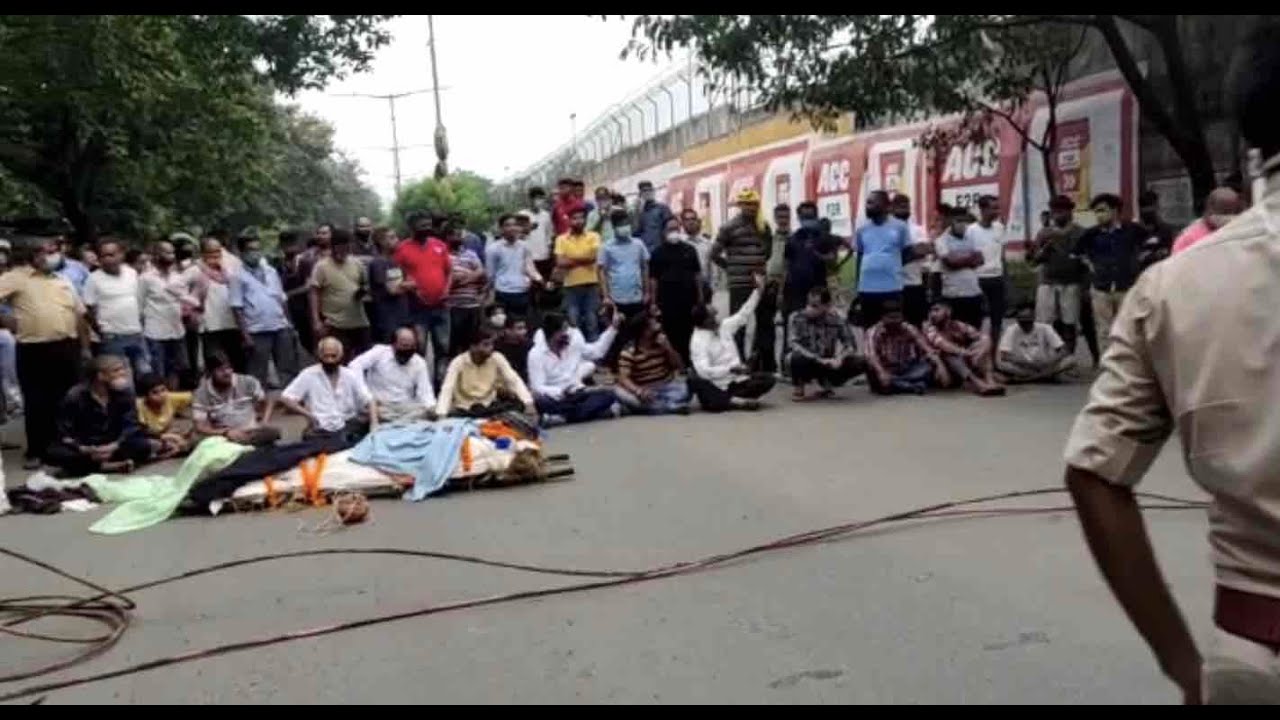 Jamshedpur: The family members of deceased SIS security guard and angry residents of Cable Bustee today blocked the Burmamines-Sakchi Main Road demanding compensation and enquiry into the suspicious death of Mandeep Kumar. They kept the dead body on the main road and were protesting in support of their two demands.