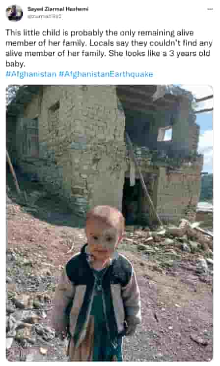 Sympathy and call for help poured on Twitter from around the world. An Afghan journalist Sayed Ziarmal Hashemi tweeted a photo of a 3-year-old girl child and said that she was the only survivor of her family as no one could be traced in her house.