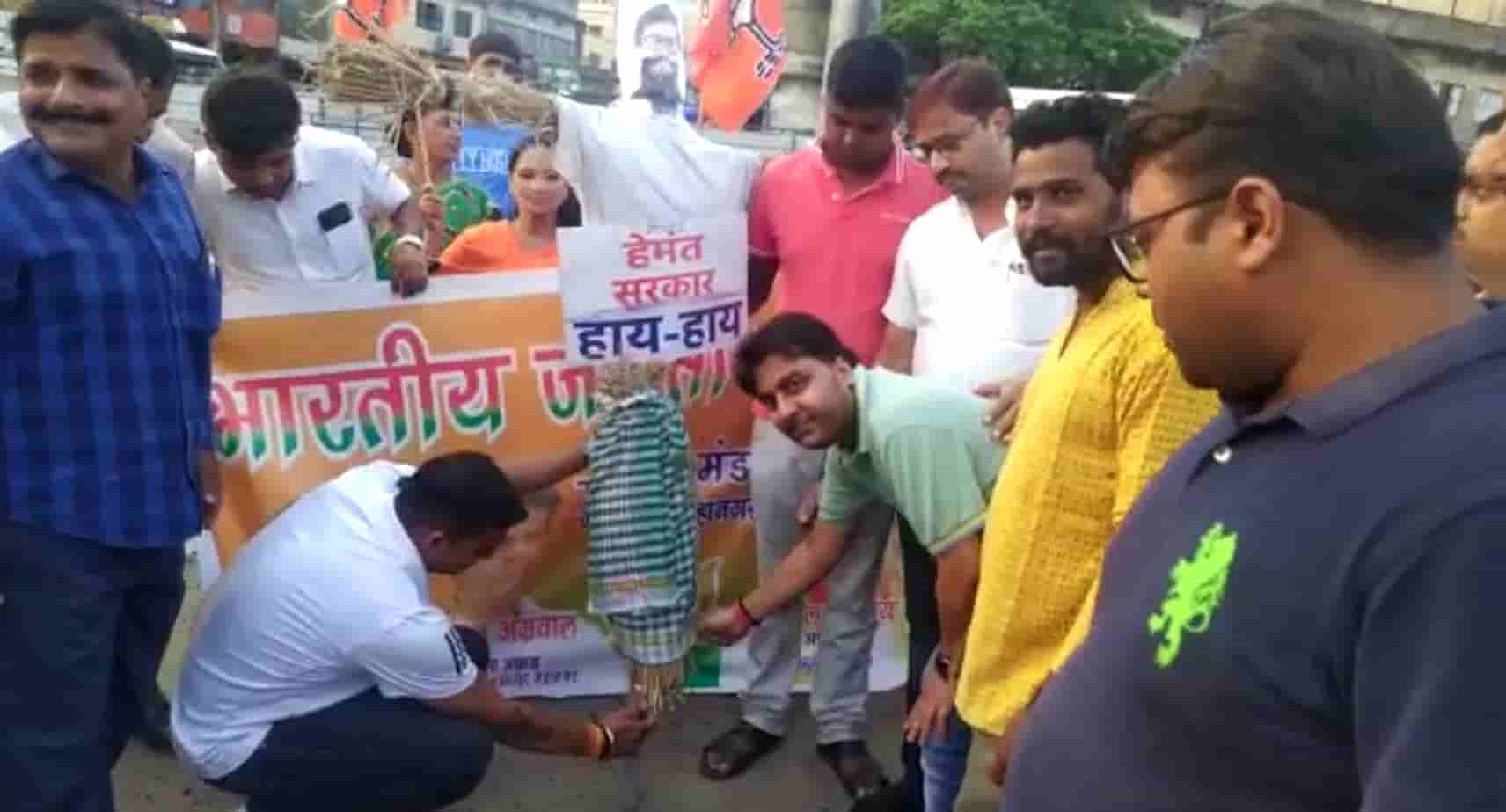 Jamshedpur: Members and supporters of BJP Yuva Morcha Mango Mandal burnt an effigy of Chief Minister Hemant Soren at Mango roundabout against the attempt to keep schools of Jamtara closed on Friday instead of Sunday.