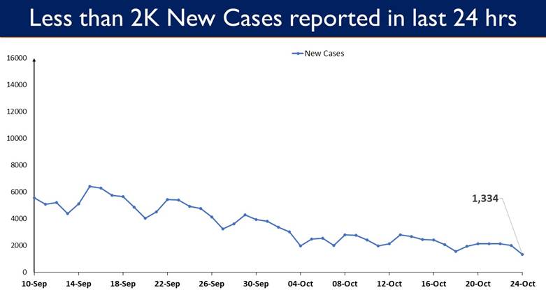 स्वास्थ्य एवं परिवार कल्याण मंत्रालय द्वारा दी गई जानकारी के अनुसार देश में पिछले 24 घंटों के दौरान, अब तक 1,334 लोग कोरोना से संक्रमित हुए हैं। कल भी यह संख्या 2 हजार के करीब थी।