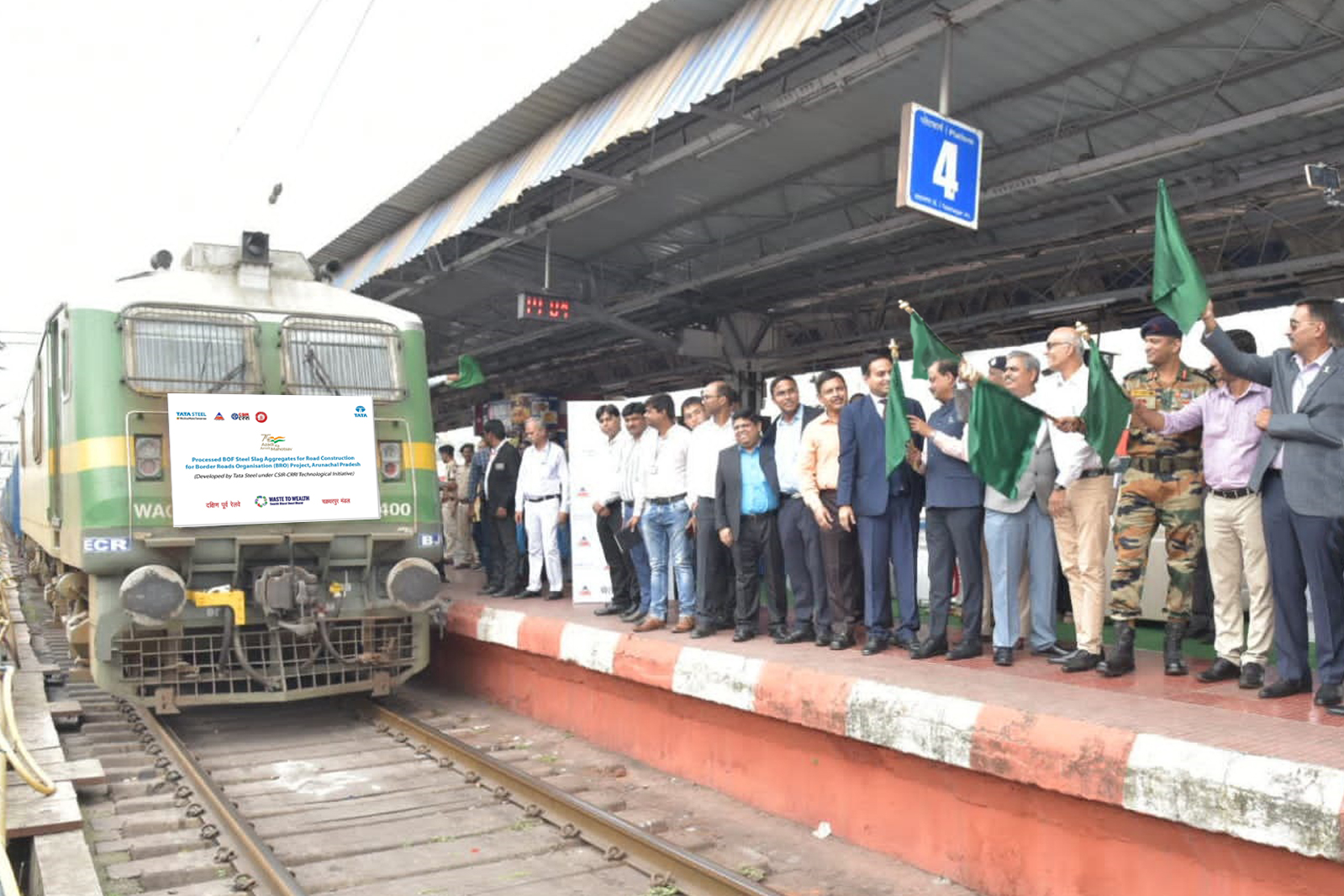 The first rake of Tata Aggreto (branded Steel Slag Aggregates) was virtually flagged off by Dr. Jitendra Singh, honorable Minister of Science & Technology, and physically by Mr Uttam Singh, Vice President Iron Making, Tata Steel, Mr Manoranjan Parida, Director CSIR-CRRI, Mr Rajesh Kumar, EIC IBMD Tata Steel and Satish Pandey, Principal Scientist, CRRI, Col. Naveen Kumar Sah, Director Works Planning, Project Arunank from Platform Number 4 at Tatanagar Railway station. Senior officials from BRO, Tata Steel, Central Road Research Institute (CRRI), Ministry of Steel, Ministry of Science and Technology, Government of India and NITI Aayog.