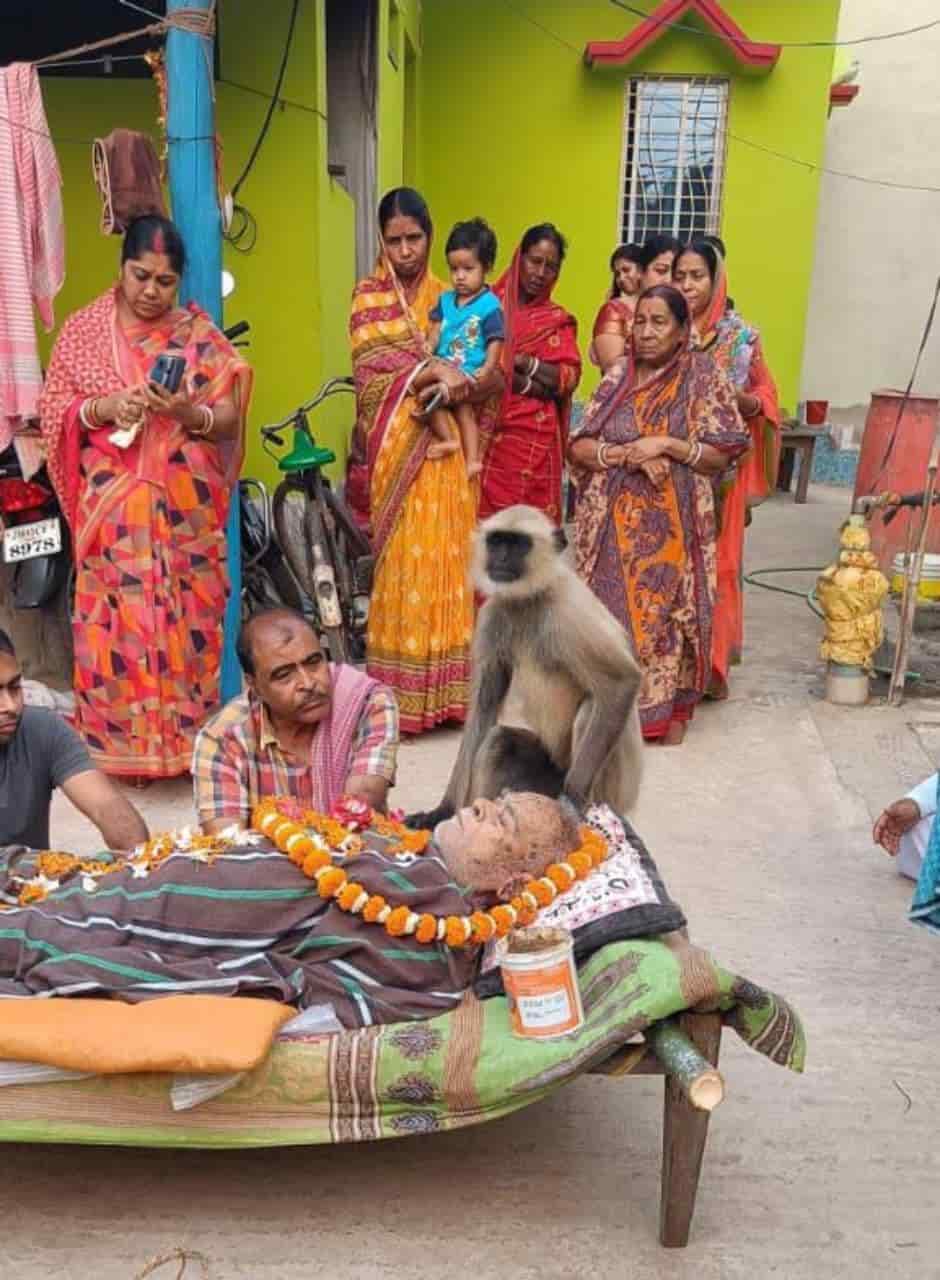 While the villagers were offering flowers on the dead body of Gaurang Pal, a langur suddenly appeared and also offered flowers on the dead body like others.