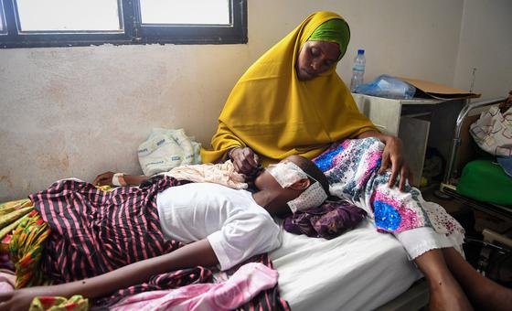 A mother caring for her 11-year-old child, who was wounded by shrapnel in a mortar attack, at the General Hospital in Garowe, Somalia on 27 February 2023.