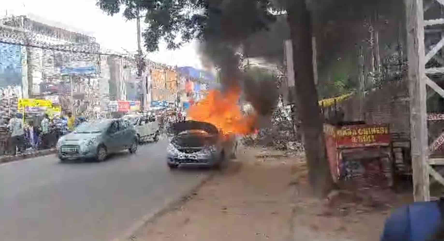 On a hot Tuesday in Ranchi, a car suddenly caught fire near Sujata Chowk, leaving it completely destroyed within minutes. The cause of the fire is under investigation.