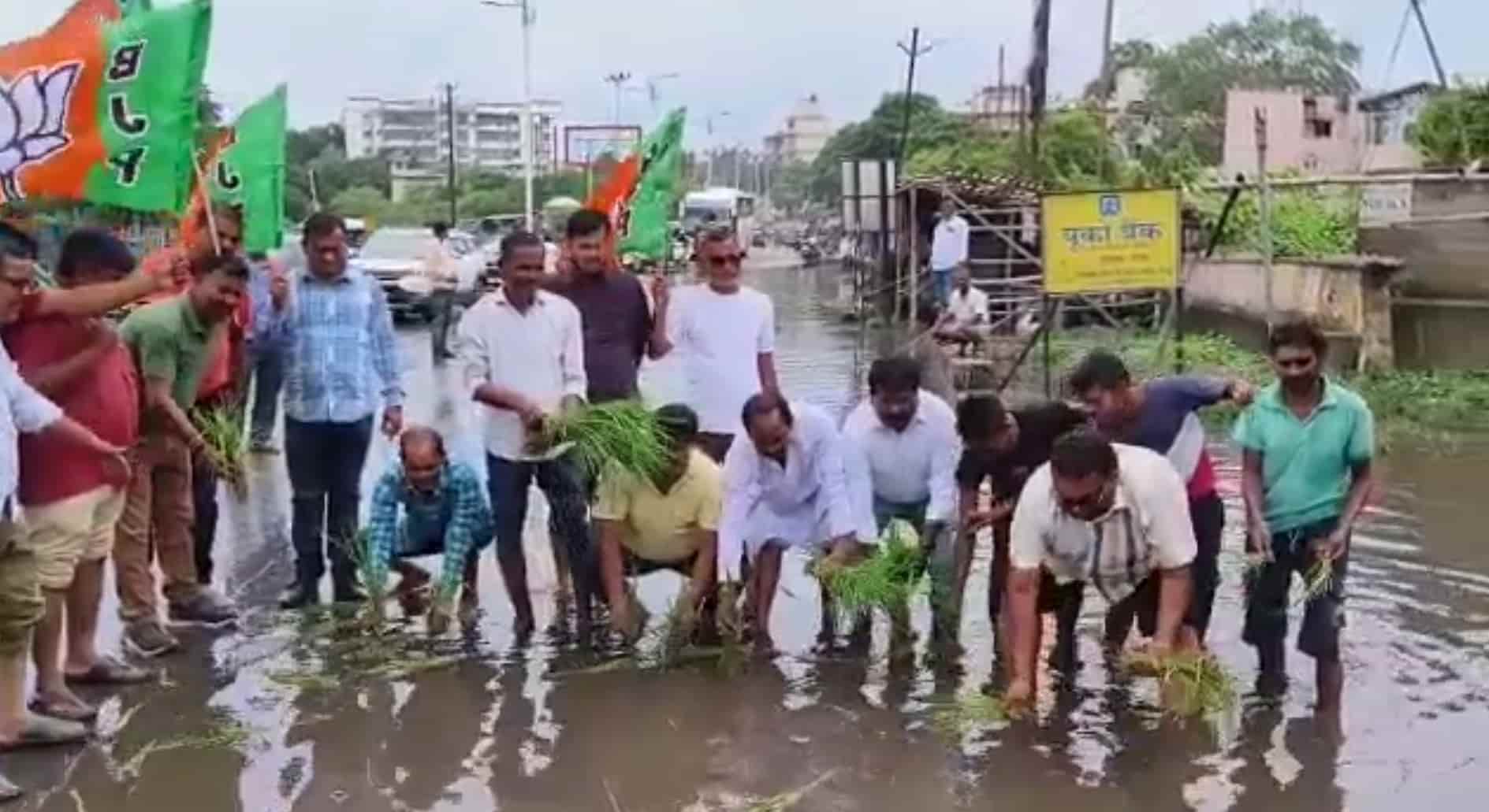 In a unique protest against waterlogging in Dhanbad, BJP workers plant paddy on roads and catch fish, exposing the corporation’s inadequate monsoon preparations.