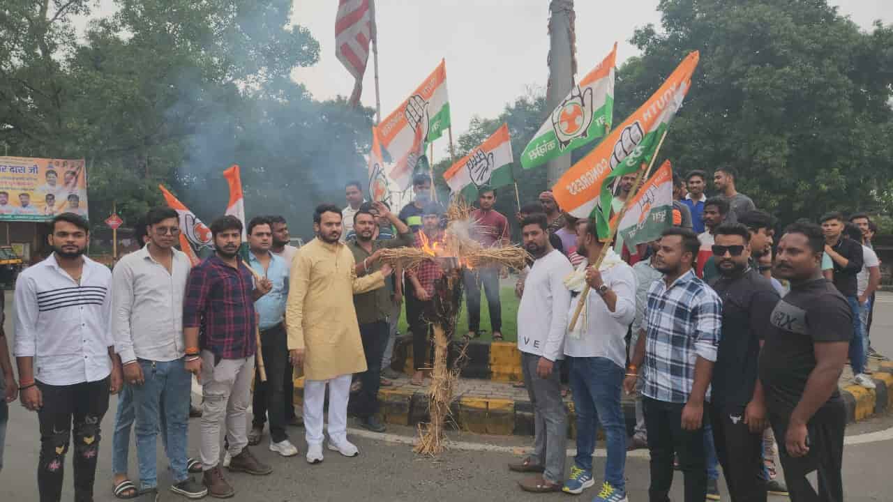 Chants of "BJP Murdabad" and "Modi Sarkar Murdabad" echoed as the effigy was set ablaze, illustrating the Youth Congress workers’ disapproval of the government’s handling of the Manipur crisis.