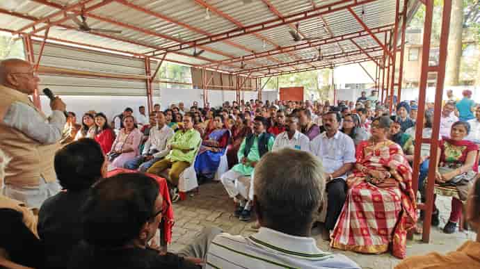 The meeting concluded with a communal lunch, attended by notable figures including Ramnarayan Sharma, Subodh Srivastava, Manju Singh, Amit Sharma, and several BJM employees and teachers.