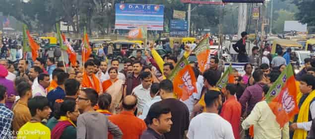 BJP celebrates assembly election victories in Chhattisgarh, Madhya Pradesh, and Rajasthan at Sakchi roundabout, Jamshedpur, under the leadership of Abhay Singh.