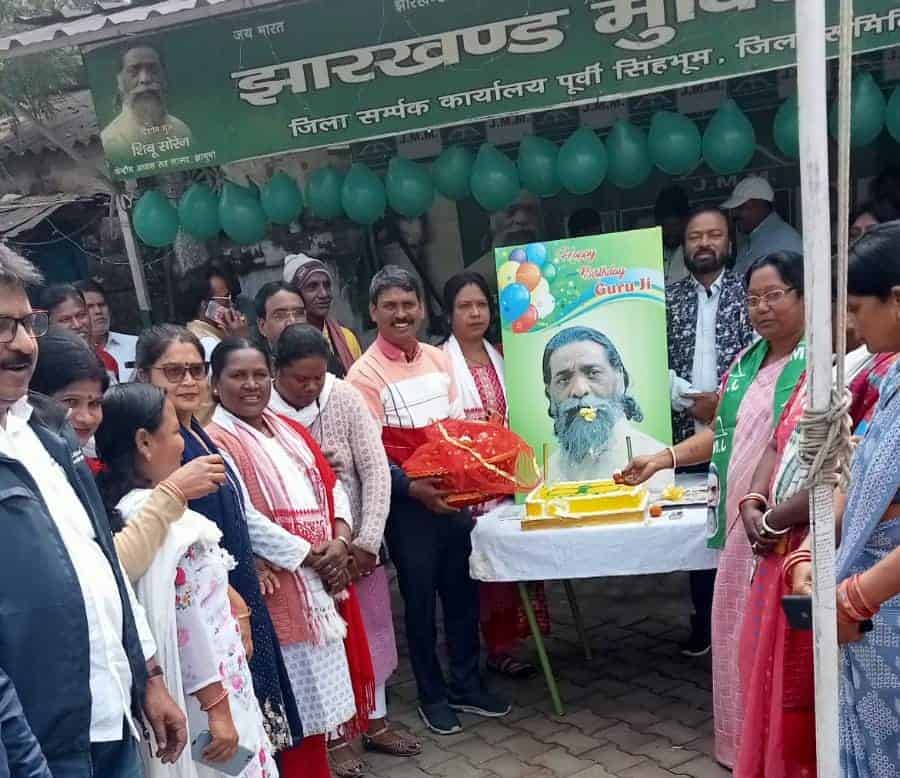 The celebration included cutting a cake at the JMM District Liaison Office and distributing fruits at the Sakchi old age home.