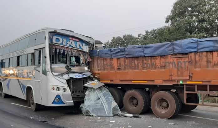 टक्कर के कारण बस के अगले हिस्से को काफी नुकसान हुआ है।