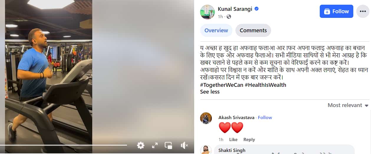 In a cryptic comment on Facebook on Thursday, he posted in Hindi: “It is spectacular that people spread the rumor themselves and then spread another rumor to defend the rumor that they have spread. I also request all media colleagues to at least take the trouble of verifying the information before running a news. Do not believe in rumors and apply your intelligence calmly. Take care of your health. Do exercise once a day.”