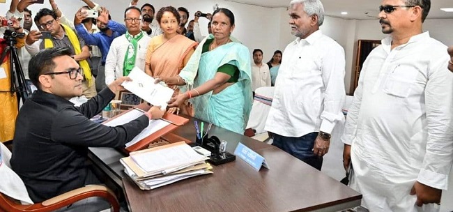 The nomination process took place on Tuesday at the office of the Deputy Commissioner, where Manjhi submitted her paperwork in four sets, surrounded by allies from various parties including Congress Minister Banna Gupta and MLA Sonaram Sinku.