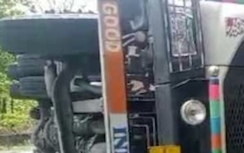 परिणामस्वरूप वाहन बीच सड़क पर पलट गया।
