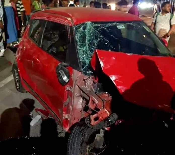 A speeding car hit a divider on Marine Drive in Jamshedpur, causing it to flip into the opposite lane. The two occupants sustained minor injuries and were rescued by locals.