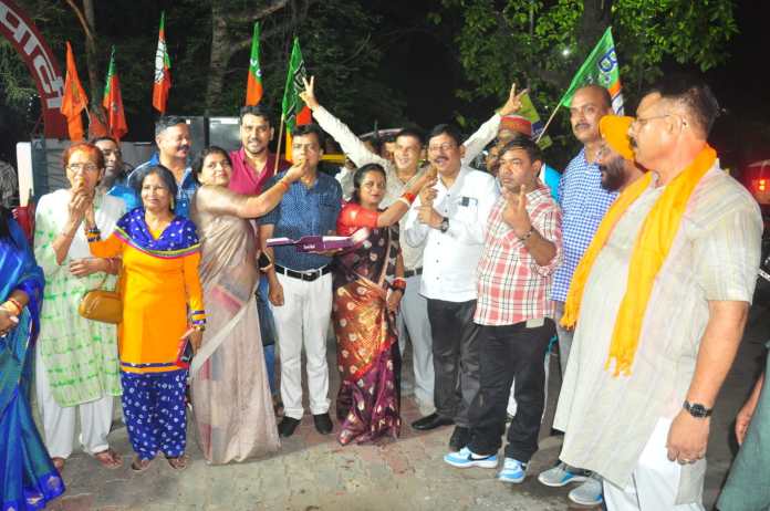 भाजपा के झंडे थामे कार्यकर्ताओं ने खुशी का इजहार किया और एक-दूसरे को लड्डू खिलाकर बधाई दी।