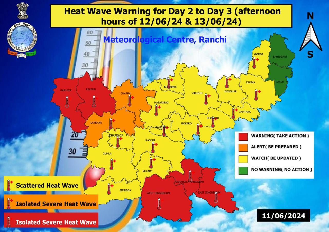 Additionally, a yellow alert for heatwave conditions has been issued for Latehar, Lohardaga, Hazaribagh, Koderma, Giridih, Bokaro, Dhanbad, Ramgarh, Ranchi, Khunti, East Singhbhum, and Seraikela Kharsawan.
