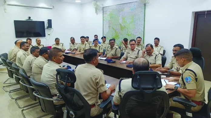 Monthly crime meeting led by Superintendent Mukesh Lunayat focuses on case resolution, warrant execution, and Bakrid festival security.