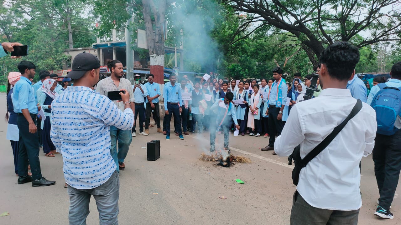 Protesters burned an effigy of Union Education Minister Dharmendra Pradhan during the demonstration.