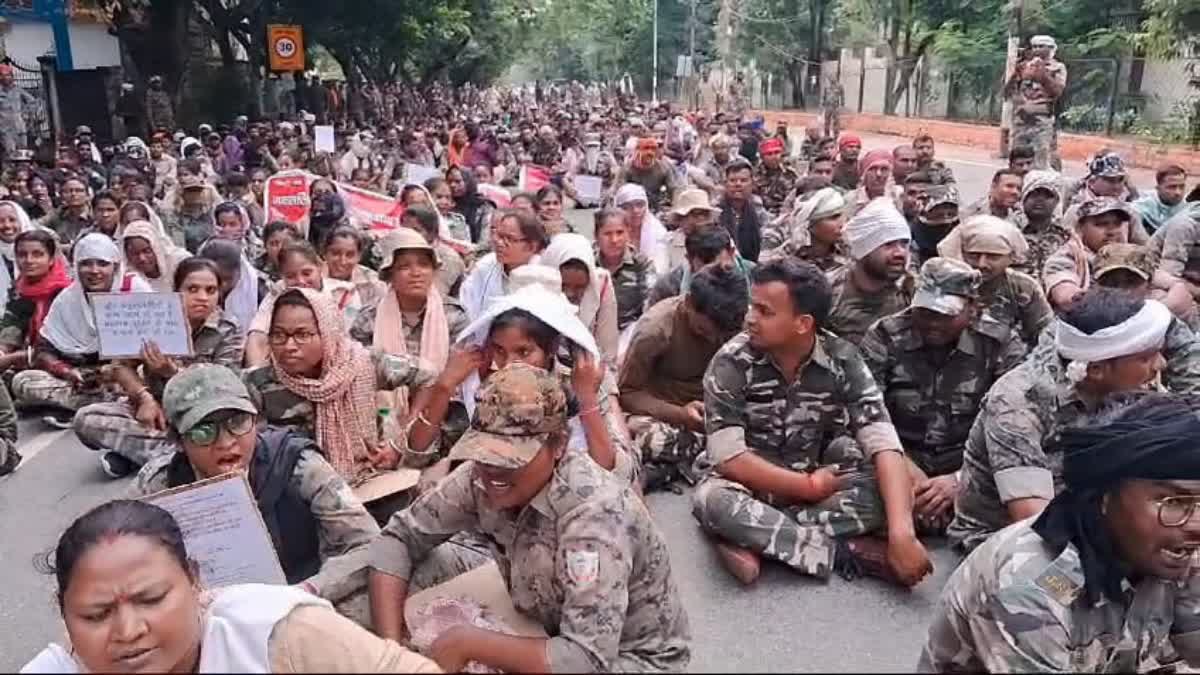 The demonstration highlights ongoing issues of temporary workers’ rights in Jharkhand’s law enforcement sector.