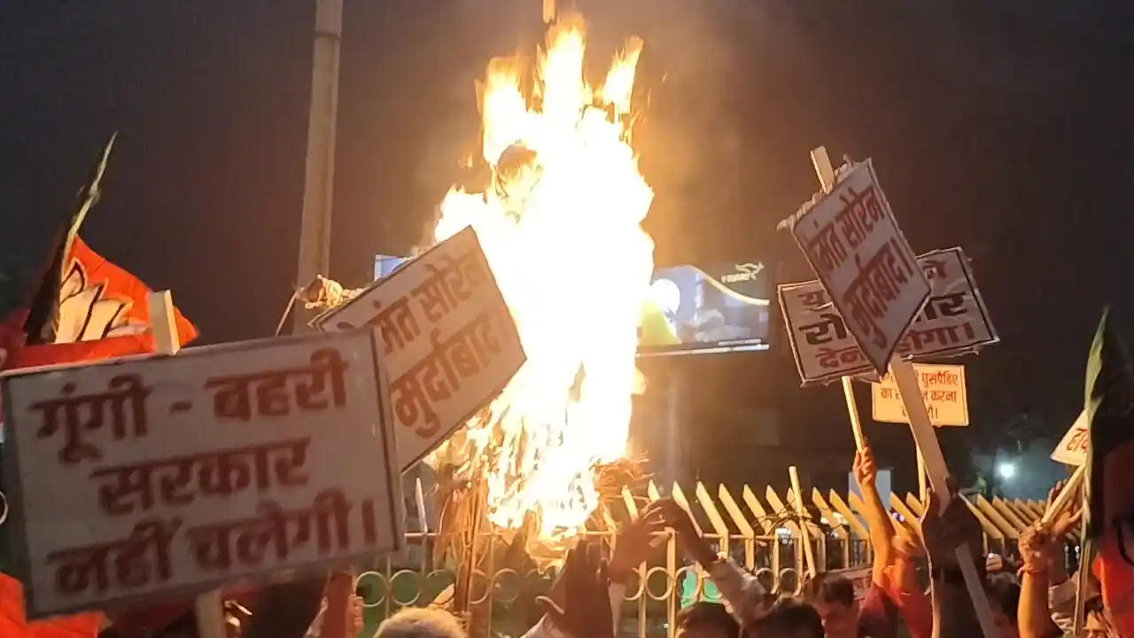 In a fervent protest, BJP members in Jamshedpur burned an effigy of Jharkhand Chief Minister Hemant Soren at Sakchi Chowk, chanting slogans like "Hemant Soren Murdabad" and "Hitlershahi Nahi Chalegi."