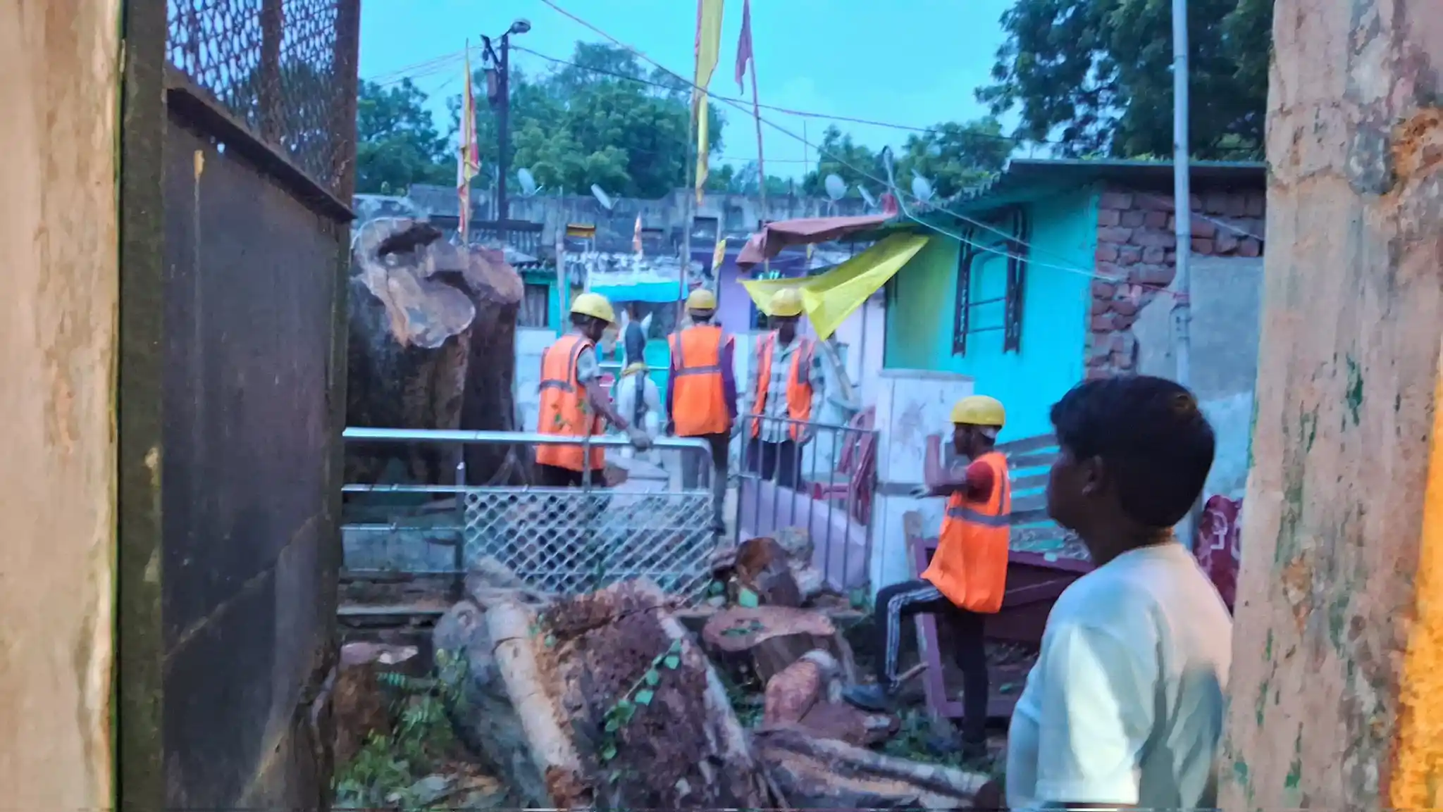 जमशेदपुर के धातकीडीह मुखी बस्ती में एक बड़ा पेड़ एक घर के पिछले दरवाजे पर गिर गया, जिससे परिवार अंदर फंस गया और निवासियों में भय पैदा हो गया।