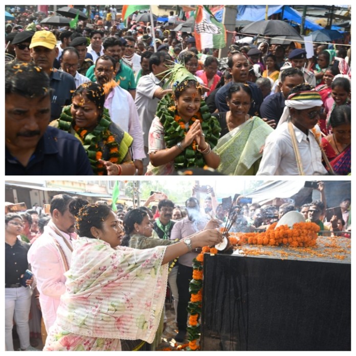 At the Goilkera market, JMM’s star campaigner Kalpana Soren, Agriculture Minister Deepika Pandey Singh, Minister of Women and Child Development Baby Devi, and Tribal Welfare Minister Deepak Biruwa laid wreaths at Majhi’s memorial site to honor his contributions to the forest and land rights movement.