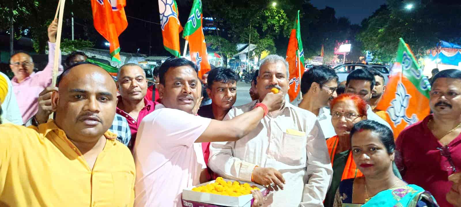 On Tuesday, under the leadership of Jamshedpur Metropolitan President Sudhanshu Ojha, BJP workers organized a victory celebration at the district office in Sakchi.