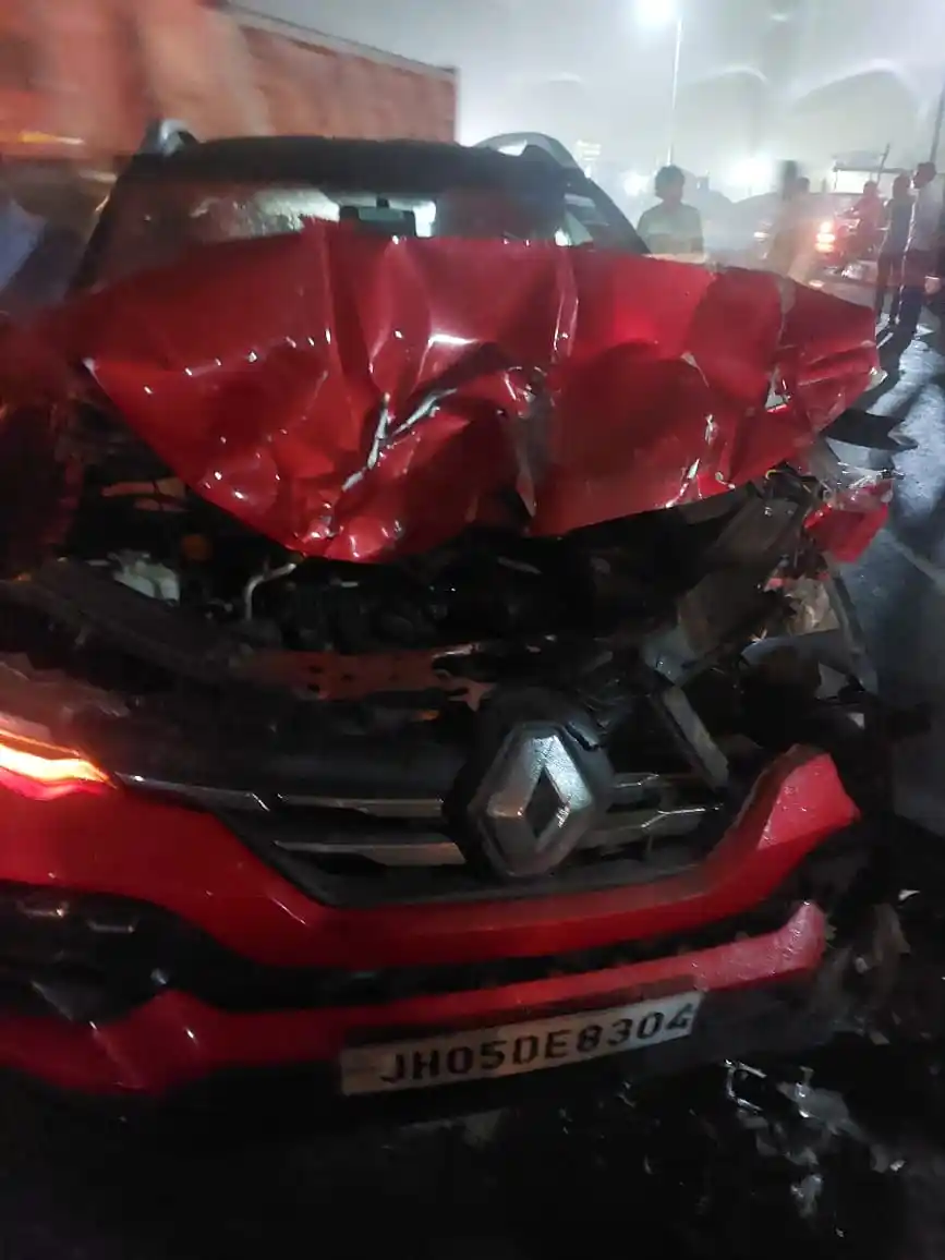 A Renault car bearing registration number JH 05 E 8304 collided with a heavy truck at the Udaygadh turn.