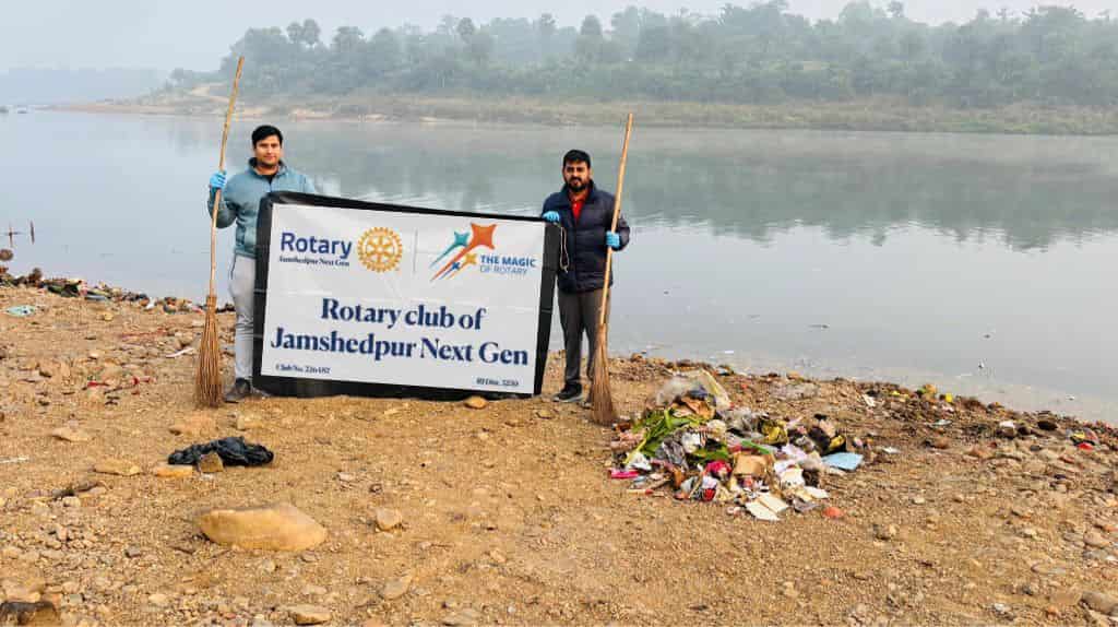 JAMSHEDPUR – Following Chhath Puja celebrations, members of Rotary Club of Jamshedpur NextGen and Rotary Club of Jamshedpur Green joined forces to clean the Domuhani riverbanks at Rivermeet. This initiative aimed to address the significant health and environmental risks posed by waste and leftover Puja materials.
