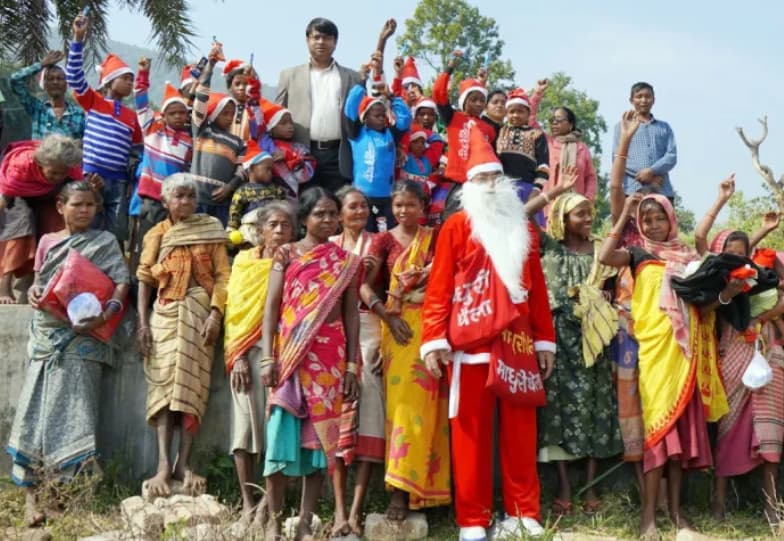 JAMSHEDPUR – Pappu Sardar, a well-known Madhuri Dixit fan, brought Christmas cheer to Khariakocha village by distributing essential winter items to underprivileged Sabar families while dressed as Santa Claus.