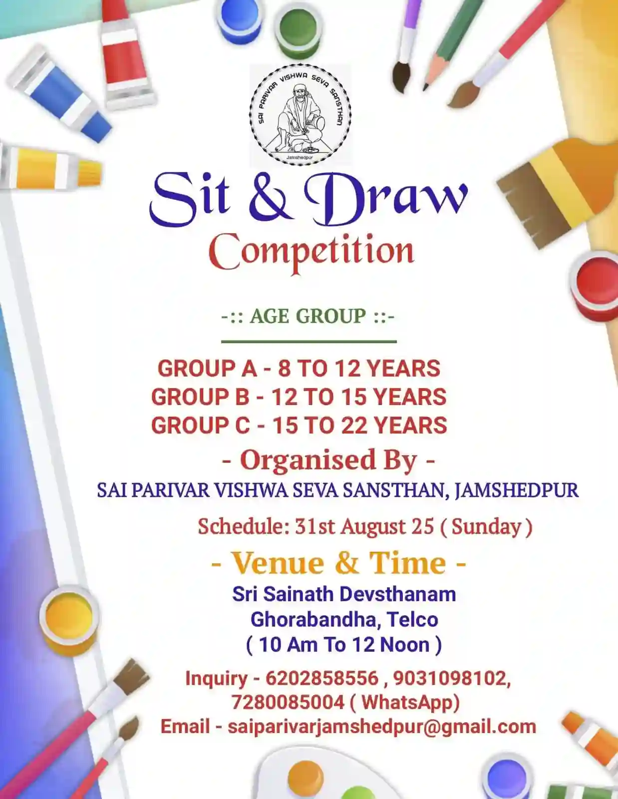 JAMSHEDPUR – Sai Parivar Vishwa Seva Sansthan will host a comprehensive drawing competition on August 31, 2025, at Sri Sainath Devasthanam in Ghorabandha area.