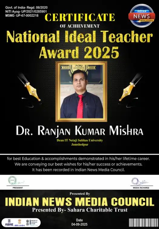 JAMSHEDPUR – Dr. Ranjan Kumar Mishra, Dean of IT at Netaji Subhas University, Jamshedpur, was conferred with the National Ideal Teacher Award 2025.
