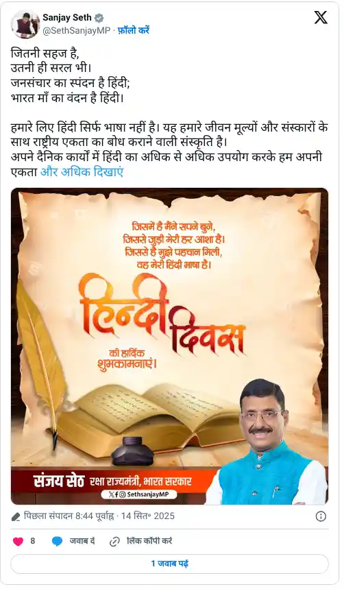 He wrote on X: “Happy Hindi Diwas to all countrymen! Contribute to the prosperity of Hindi, a simple and easy language that binds the country together.”