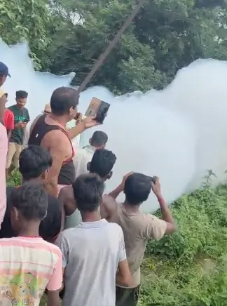 Crowd Gathers as Cloud-Like Foam Emerges Along NH-18