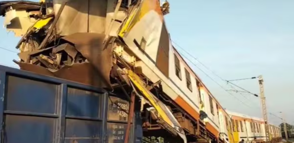 मालगाड़ी के ऊपर चढ़े मेमू के डिब्बे