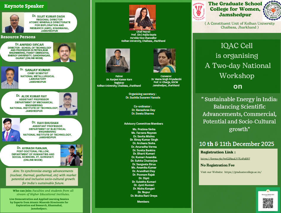 जमशेदपुर के द ग्रेजुएट स्कूल कॉलेज फॉर विमेन में 10 दिसंबर से भारत में सस्टेनेबल एनर्जी पर दो दिवसीय कार्यशाला