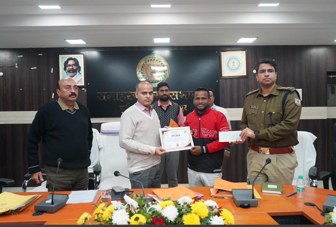 मौके पर सड़क दुर्घटना में घायल व्यक्ति को गोल्डन ऑवर में अस्पताल पहुंचाने पर जादूगोड़ा के गुड समारिटन धरनी दास को नकद 2000 रू. एवं प्रशस्ति पत्र प्रदान किया गया।