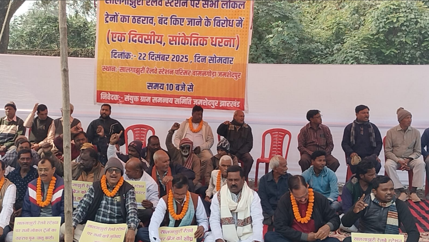 जमशेदपुर : संयुक्त ग्राम सामान्य समिति, जमशेदपुर के बैनर तले आज सलगाझुड़ी रेलवे स्टेशन पर एकदिवसीय धरना-प्रदर्शन किया गया। यह धरना लोकल ट्रेनों के ठहराव की बहुप्रतीक्षित मांग को लेकर आयोजित किया गया, जिसमें बड़ी संख्या में स्थानीय ग्रामीण एवं क्षेत्रवासी शामिल हुए।