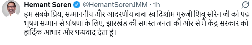 शिबू सोरेन को मरणोपरांत पद्म भूषण देने की घोषणा