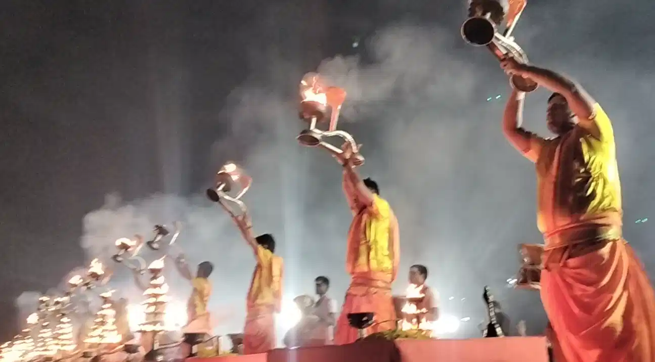 The synchronized aarti created a luminous spectacle. Moreover, incense fragrance and devotional songs filled the air.