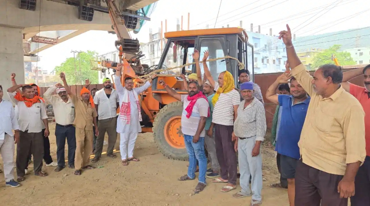 - Ex-BJP leader Vikas Singh leads protest; machines and workers tied with ropes